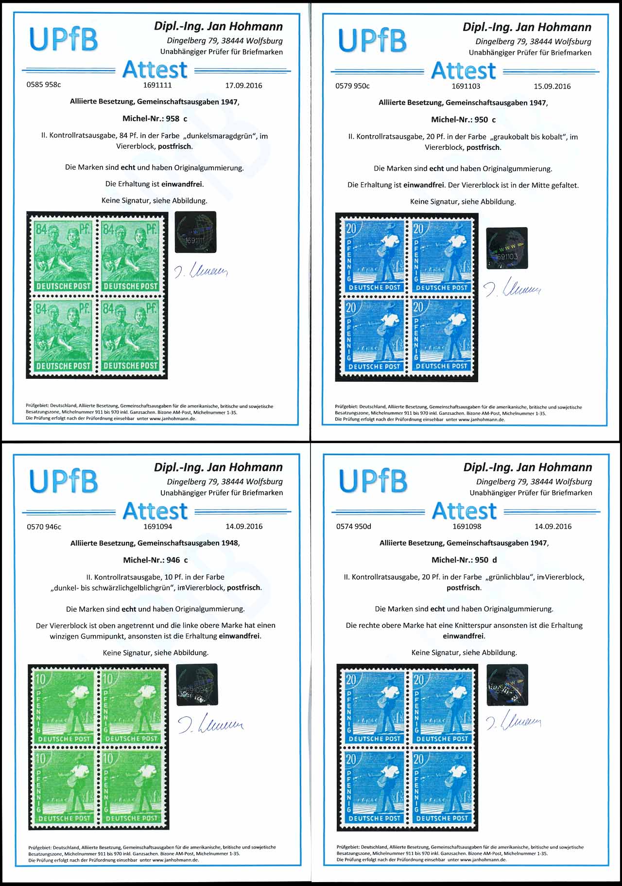 10, 20 und 84 Pfennig, Farbenlot aus der 2. Kontrollratsausgabe, jeweils im Viererblock, MiNr. 946c, 950c, 950d und 958c, in postfrischer Erhaltung mit minimalen Einschränkungen: MiNr. 946c, linke obere Marke mit winzigem Gummipunkt, MiNr. 950c Viererblock in der Mitte gefaltet, MiNr. 950d an der linken oberen Marke eine Knitterspur. Der Viererblock der MiNr. 958c ist in einwandfreier Erhaltung, je Viererblock Fotoattest Dipl.-Ing. Jan Hohmann UPfB (2016), Mi. 3.220.-