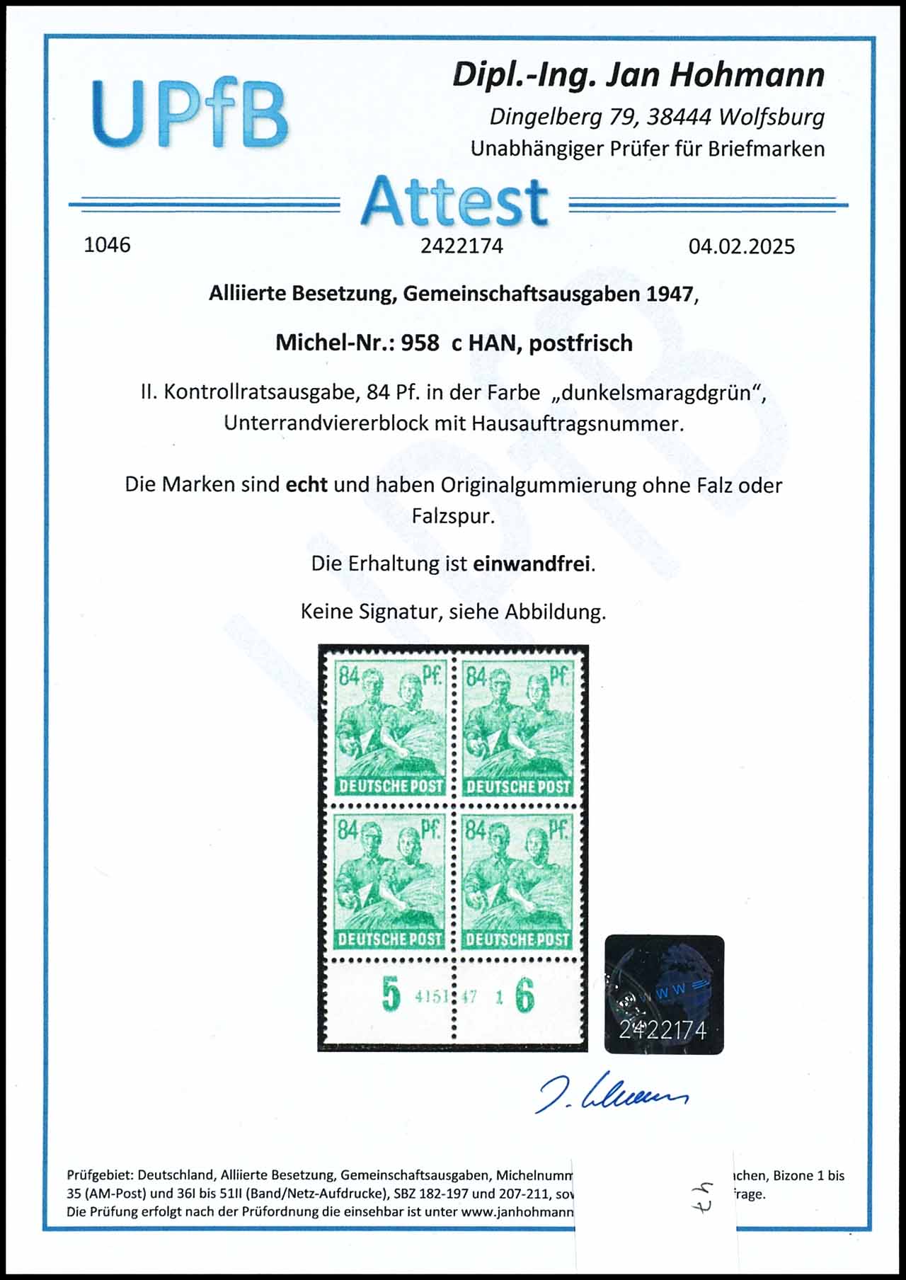 84 Pfennig Viererblock, dunkelsmaragdgrün, mit Hausauftragsnummer HAN 4151 47, postfrisch, tadellos, Attest Dipl-Ing. Jan Hohmann UPfB (2025) "Die Erhaltung ist einwandfrei", Mi. nicht bewertet