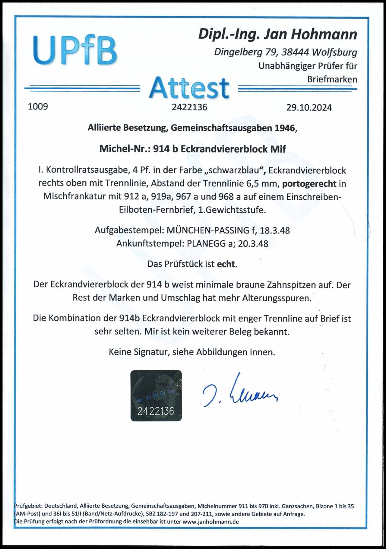 4 Pfennig schwarzblau, rechter oberer Eckrandviererblock mit enger Trennlinie in Mischfrankatur mit 912a, 919a, 967a und 968a, entwertet mit Stempel "MÜNCHEN-PASING f 18.3.48", Einschreiben-Eil-Fernbrief der ersten Gewichtsstufe, portorichtig, sehr gut erhalten, der Viererblock der 914b weist minimal braune Zahnspitzen auf, Rest der Marken ebenfalls Alterungsspuren, unsigniert, Attest Dipl.-Ing. Jan Hohmann UPfB (2024)