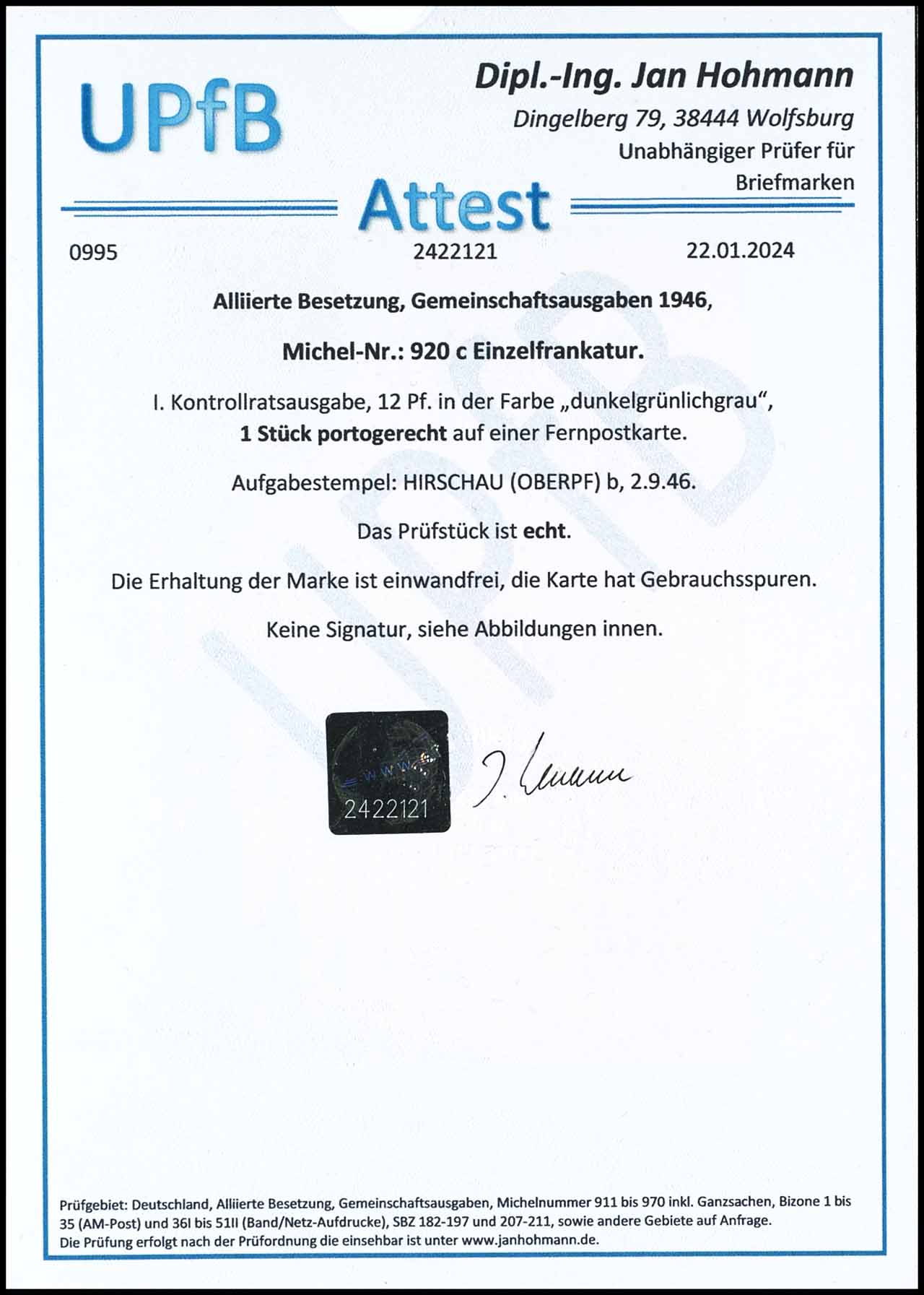 12 Pfennig grau, c-Farbe, Einzelfrankatur auf Fernpostkarte, tadellose Erhaltung, entwertet mit Stempel "HIRSCHAU (OBERPF) b 2.9.46", minimale Gebrauchspuren an der Postkarte, Attest Dipl.-Ing. Jan Hohmann UPfB (2024), "Die Erhaltung der Marke ist einwandfrei", Mi. 1.500.-