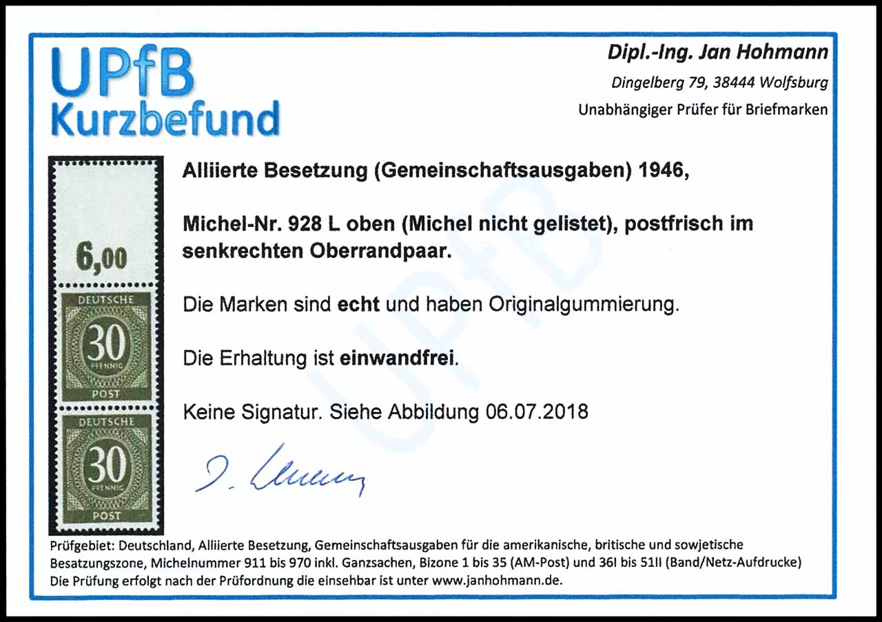 30 Pfennig, I. Kontrollratsausgabe, dunkelgrauoliv, senkrechtes Oberrandpaar mit anhängendem und durchgezähntem Leerfeld im Oberrand mit Zähnungsschlag oben, tadellose Erhaltung mit Originalgummierung, Fotobefund Dipl.-Ing. Jan Hohmann UPfB (2018) "Die Erhaltung ist einwandfrei", Mi. -.-