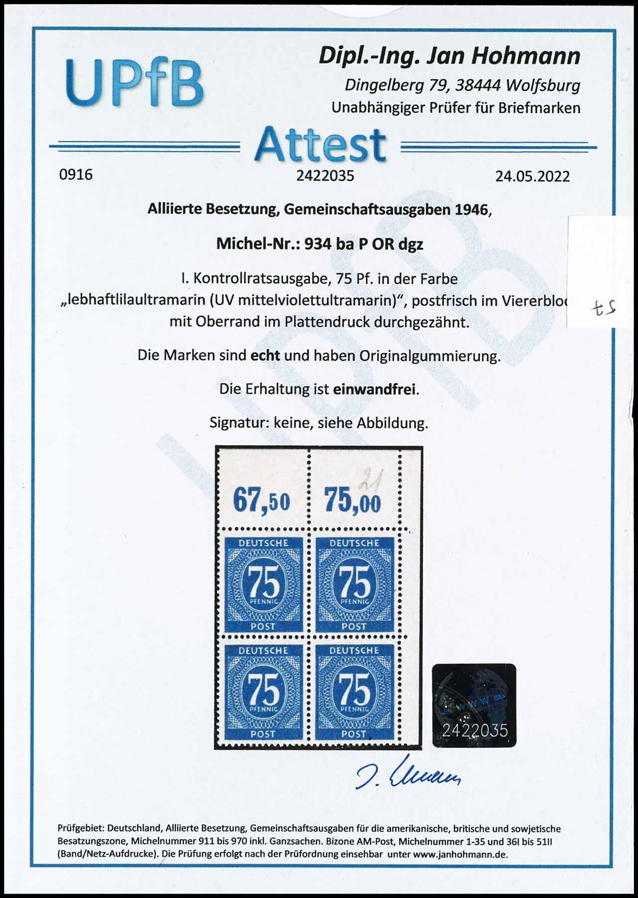 75 Pfennig lebhaftlilaultramarin (UV mittelviolettultramarin), Eckrandviererblock oben rechts im Plattendruck mit durchgezähntem Oberrand, postfrisch, tadellose Erhaltung, Attest Dipl.-Ing. Jan Hohmann UPfB (2022) "Die Erhaltung ist einwandfrei", Mi. 1.200.-