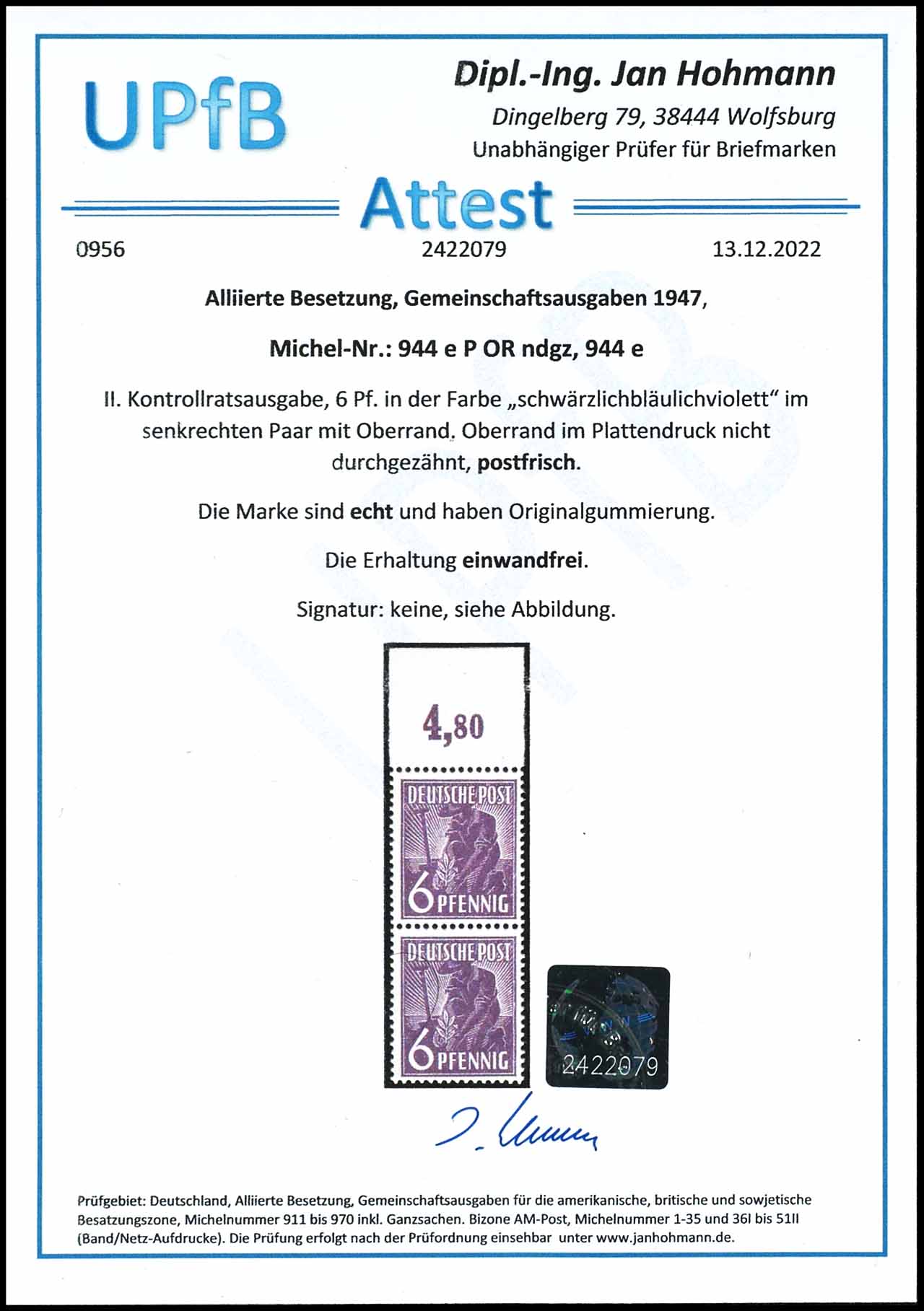 6 Pfennig, II. Kontrollratsausgabe, schwärzlichblauviolett, e-Farbe, senkrechtes Oberrandpaar im Plattendruck, Oberrand nicht durchgezähnt, tadellose Erhaltung, Originalgummierung, Attest Dipl.-Ing. Jan Hohmann UPfB (2022) "Die Erhaltung ist einwandfrei", Mi. 800.-