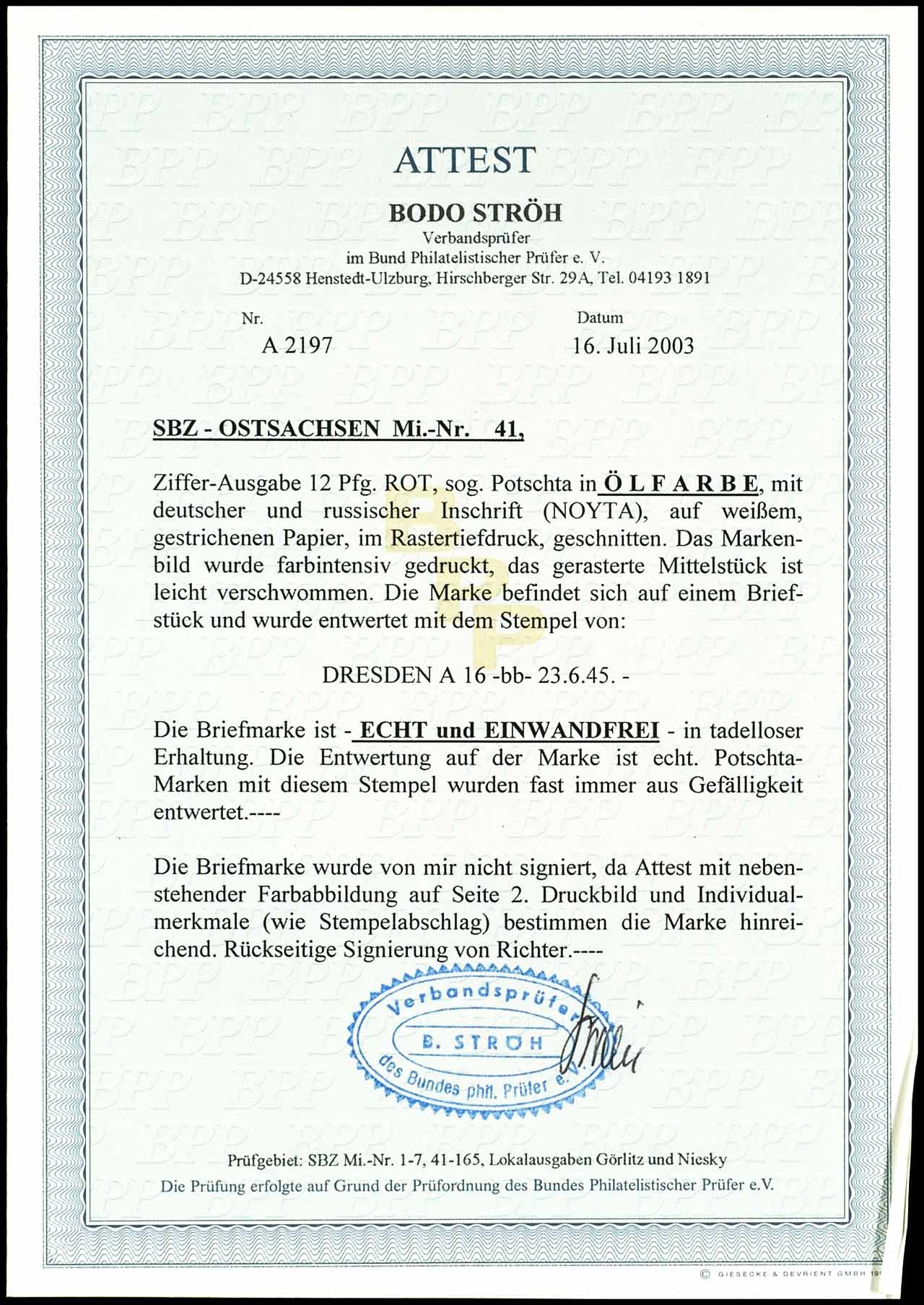 Nicht ausgegeben: 12 Pfennig Ziffern, sog. "Potschta", Ölfarbe, gefälligkeitsentwertet "DRESDEN A 16 bb 23.6.45" auf Briefstück, Fotoattest Bodo Ströh BPP "echt und einwandfrei"