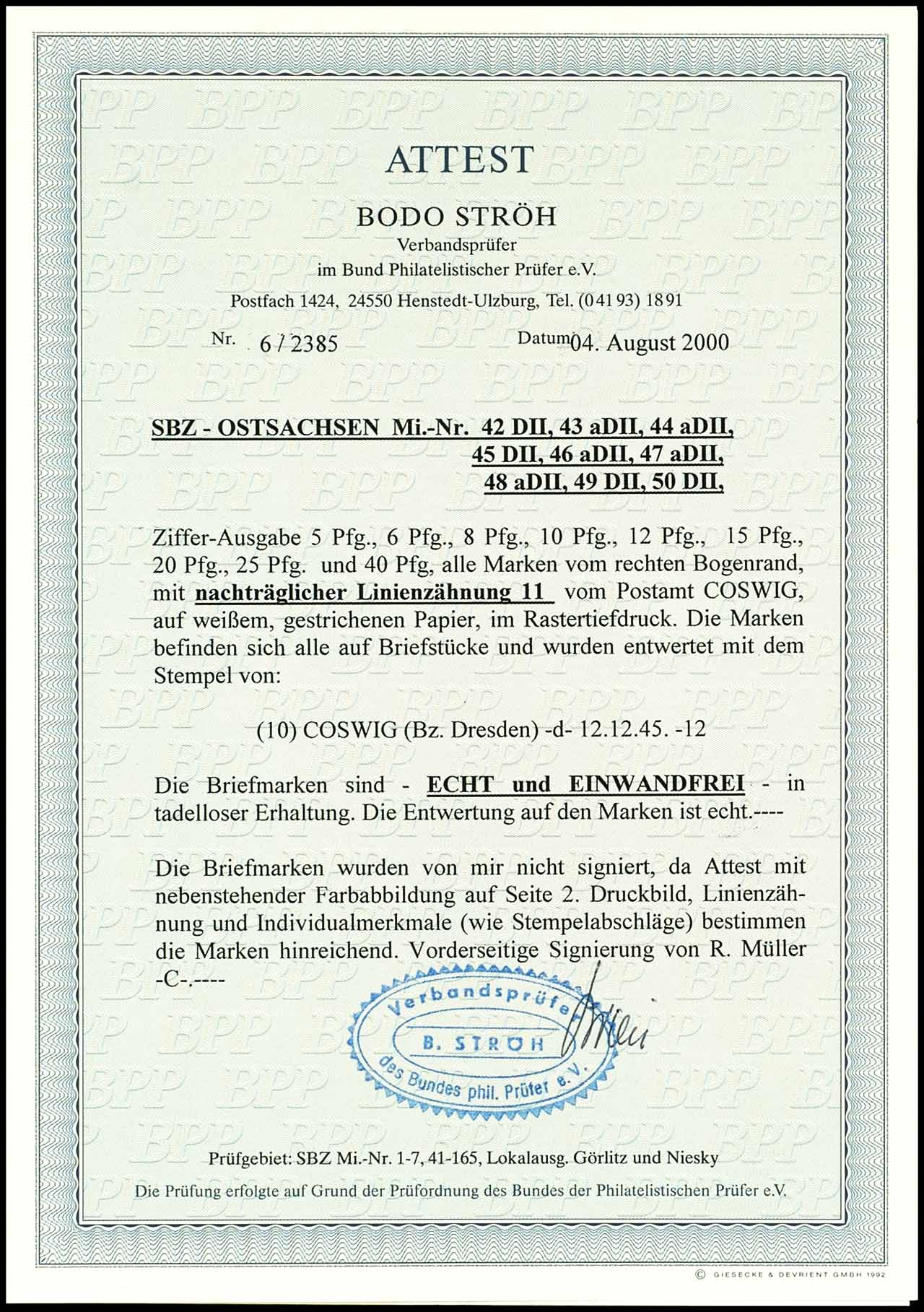 5 Pfennig bis 40 Pfennig Ziffern, Postmeistertrennung Coswig 11 1/2, kompletter Satz mit neun Werten, gestempelt "(10) Coswig (Bz. Dresden) -d- 12.12.45" auf Briefstücken, tadellose Erhaltung, Fotoattest Bodoh Ströh BPP "echt und einwandfrei - in tadelloser Erhaltung.", Mi. 550.-