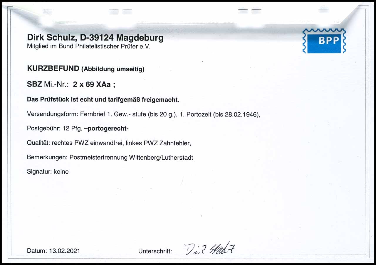 6 und 12 Pfennig, Postmeistertrennung Wittenberg/Lutherstadt als Einzel- bzw. Doppelfrankatur je auf Fernbrief, jeweils mit kleinen Zahnfehlern, je Fotobefund Dirk Schulz BPP (2021), Mi. 540.-