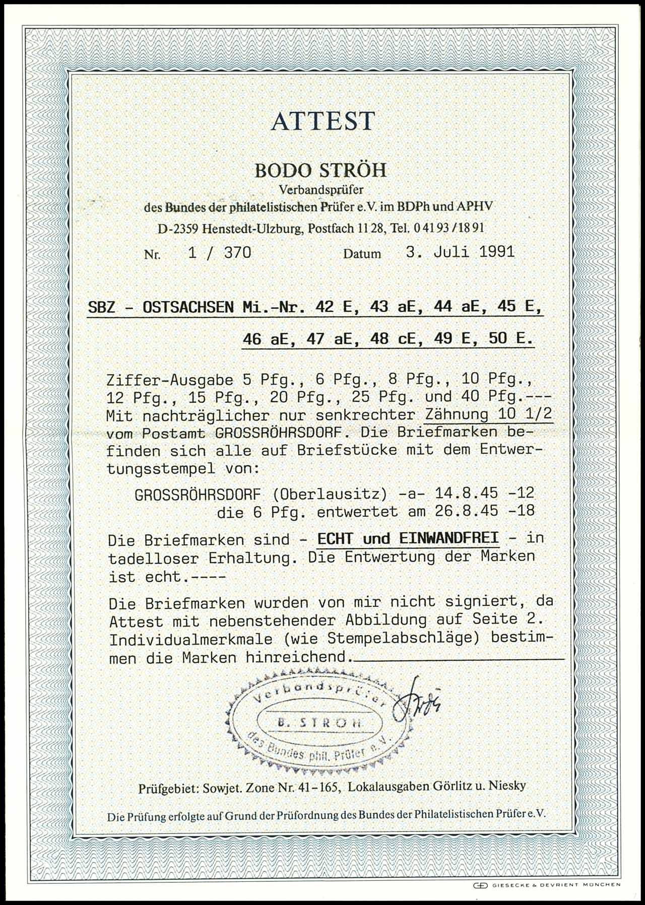 5 Pfennig - 40 Pfennig Ziffern mit Postmeisterzähnung Großröhrsdorf, kompletter Satz mit neun Werten, alle ideal zentrisch gestempelt "GROSSRÖHRSDORF (Oberlausitz) -a-" mit Datum 14.8.45 bzw. 6 Pfennig 26.8.45. -12", Fotoattest Bodo Ströh BPP "echt und einwandfrei - in tadelloser Erhaltung.", Mi. 1.100.-