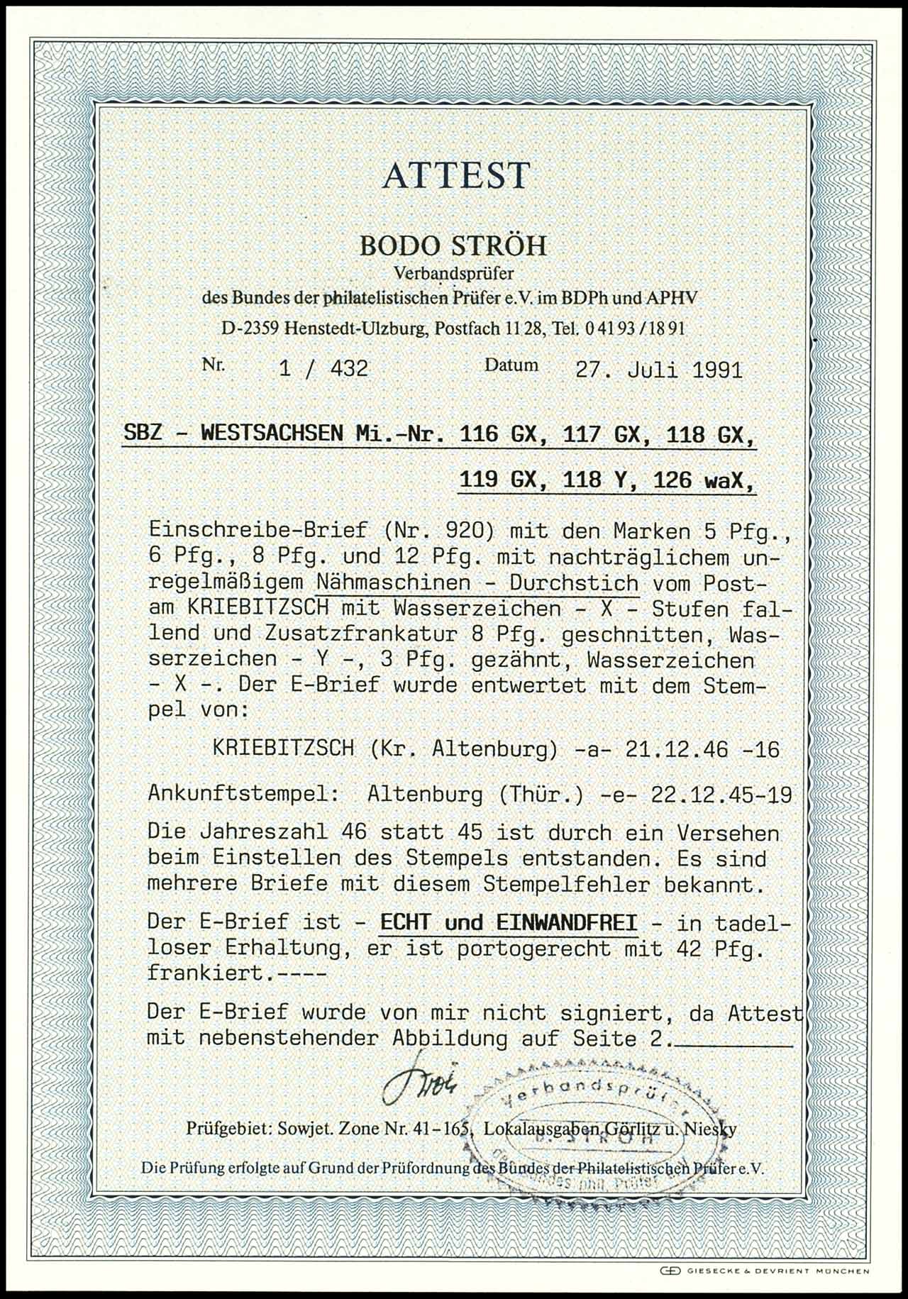 5 Pfg, 6 Pfg, 8 Pfg und 12 Pfg Ziffern mit Postmeistertrennung Kriebitzsch mit Zufrankatur auf portogerecht frankiertem R-Brief von "KRIEBITZSCH 21.12.46" (Datumsfehleinstellung - mehrere Briefe bekannt) nach Altenburg (Thüringen) mit Ank.-Stempel 22.12.45, Fotoattest Bodo Ströh BPP "echt und einwandfrei"