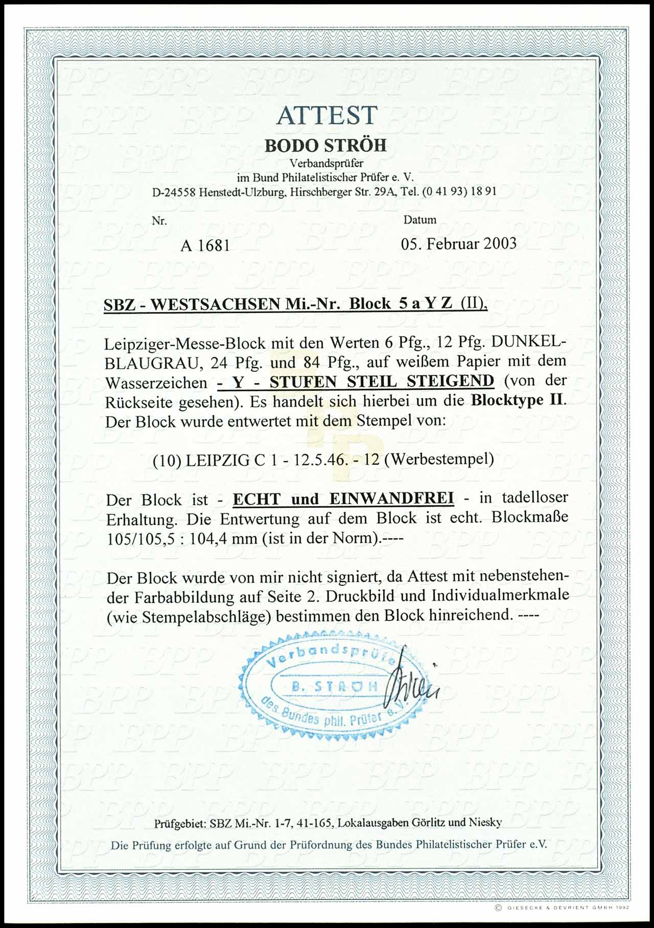 Blockausgabe "Leipziger Messe", Wasserzeichen "Y" Stufen steil steigend, Type II, gestempelt mit Sonderstempel "LEIPZIG C1 12.5.46", tadellose Erhaltung, Fotoattest Bodo Ströh BPP "echt und einwandfrei", Mi. 1.200.-