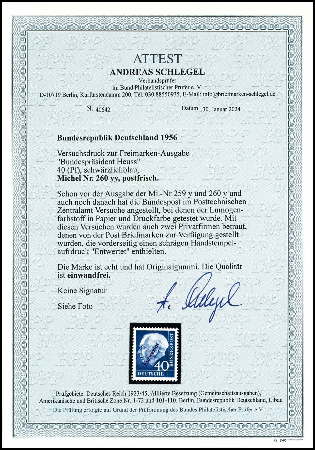 40 Pfennig Heuss auf fluoreszierendem Papier in abweichender Farbe schwärzlichblau mit Handstempelaufdruck "Entwertet", zu Versuchszwecken 1960 hergestellt. postfrisch, tadellose Erhaltung, Fotoattest Andreas Schlegel BPP (2024) "Die Qualität ist einwandfrei.", Mi. 1.000.-
