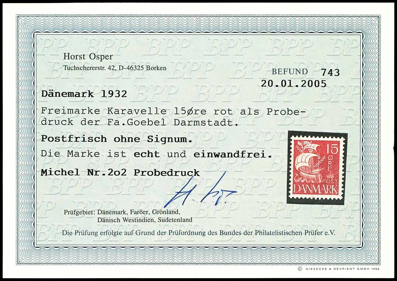 15 Öre Karavelle, 1932, rot, als Probedruck der Firma Goebel in Darmstadt, tadellos, Fotobefund Horst Osper BPP "echt und einwandfrei"