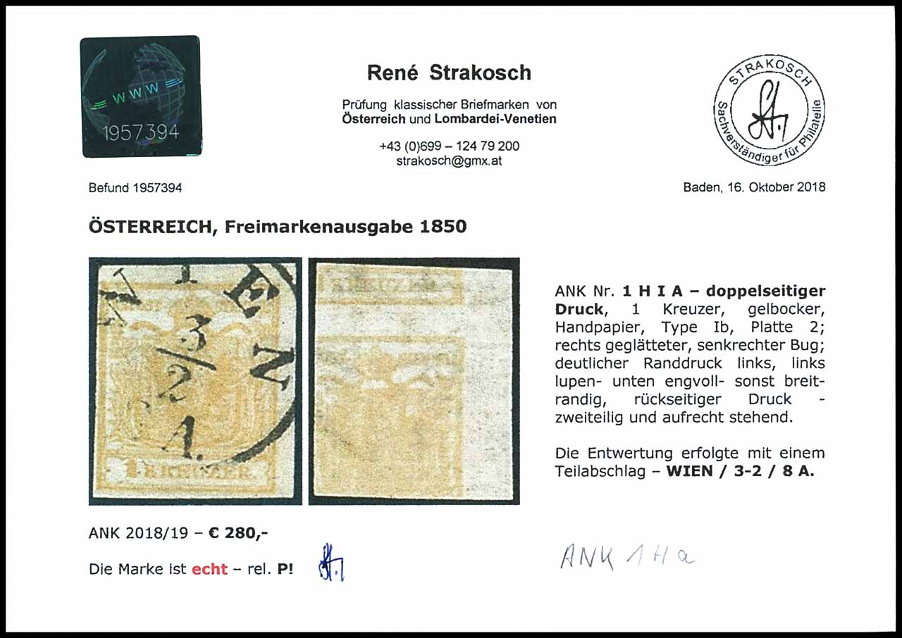 1 Kreuzer Wappenzeichnung, gelbocker, Handpapier, Ferchenbauer Type Ib Platte 2, links deutlicher Randdruck, unten knapp vollrandig, sonst breitrandig, rechts geglätteter senkrechter Bug, Abart: rückseitger Druck, zweigeteilt, senkrecht stehend, entwertet mit Stempelabschlag "WIEN 3/2 8 A.", sehr gute Erhaltung, Fotobefund Rene Strakosch (2018) ANK 280.-