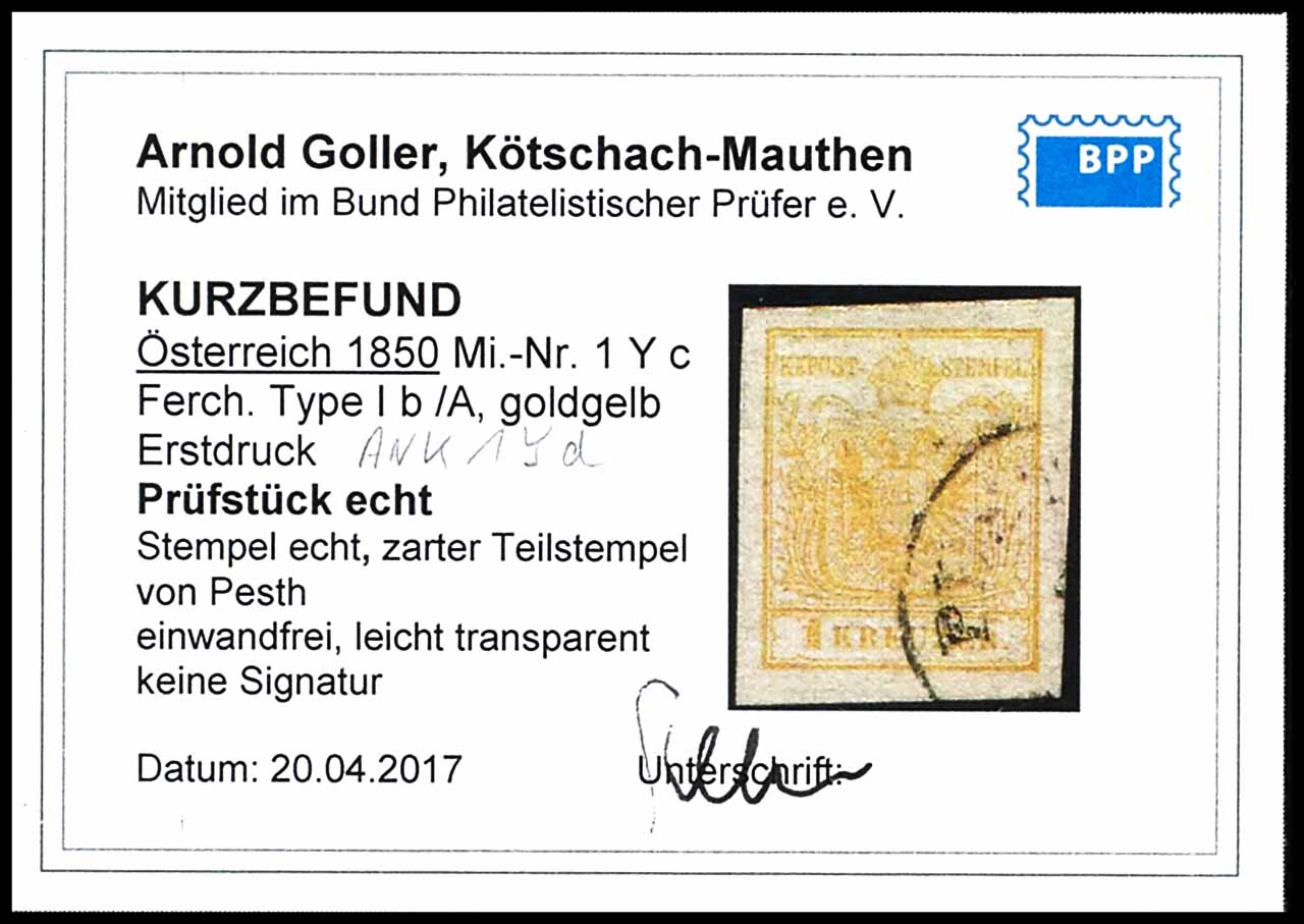 1 Kreuzer Wappenzeichnung, goldgelb, Maschinenpapier, Erstdruck, Ferchenbauer Type Ib/A, allseitig vollrandig, entwertet mit Teilstempelabschlag "PESTH", tadellose Erhaltung, Kurzbefund Arnold Goller BPP (2017) "echt und einwandfrei", ANK 320.-