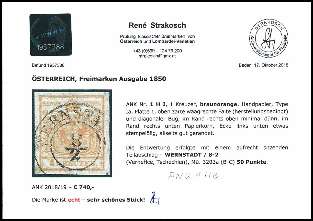 1 Kreuzer Wappenzeichnung, braunorange, Handpapier, Ferchenbauer Type Ia Platte 1, allseits vollrandig, geglätteter diagonaler Bug, im Rand oben minimal dünn, herstellungsbedingte waagrechte Falte oben und im Rand unten rechts ein Papierkorn, entwertet mit böhmischem Zweikreisstempel "WERNSTADT 8-2", Müller Nr. 3203a (B-C) 50 Punkte, links unten etwas stempelölig, insgesamt sehr gute Erhaltung, Bleistiftsignatur, Fotobefund Rene Strakosch (2018) "echt, sehr schönes Stück", ANK 740.-