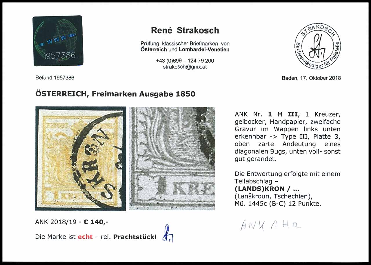 1 Kreuzer Wappenzeichnung, gelbocker, Handpapier, Ferchenbauer Type III Platte 3, allseits vollrandig, oben geglätteter Diagonalbug, entwertet mit böhmischem Stempelabschlag "(LANDS)KRON...", sehr gute Erhaltung, Bleistiftnotation, Fotobefund Rene Strakosch (2018) ANK 140.-