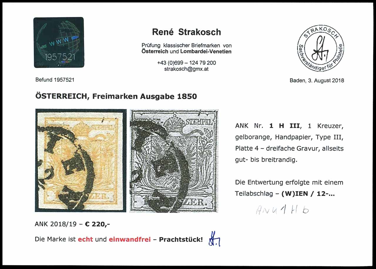 1 Kreuzer Wappenzeichnung, gelborange, Handpapier, Ferchenbauer Type III Platte 4, allseits vollrandig, entwertet mit Stempelabschlag "(W)IEN 12...", tadellose Erhaltung, Bleistiftnotation, violettes Zeichen, Fotobefund Rene Strakosch (2018), "echt und einwandfrei", ANK 220.-