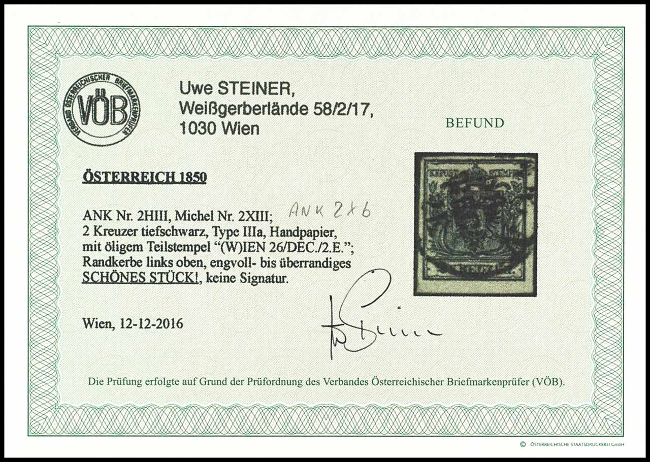 2 Kreuzer Wappenausgabe, 1850, Handpapier, Farbnuance: tiefschwarz, ANK-Nr. 2HIII, Ferchenbauer Type IIIa, entwertet mit Einkreisstempel "(W)IEN 26 DEC 2.E", allseitig vollrandig, farbfrisches Exemplar, Fotobefund Uwe Steiner (2016), ANK 160.-