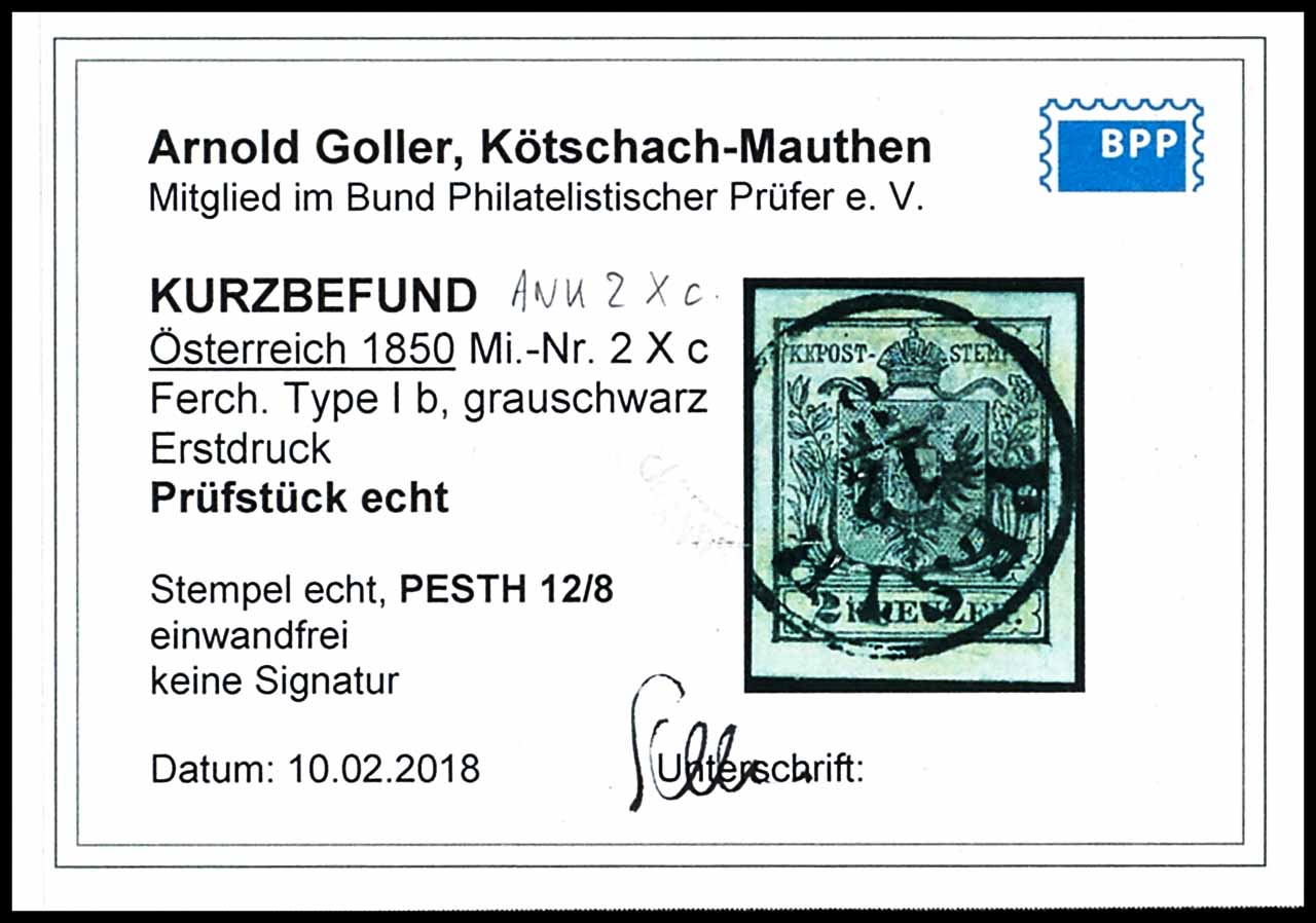 2 Kreuzer Wappenausgabe, 1850, Handpapier, Farbnuance: grauschwarz, Erstdruck, ANK-Nr. 2HI, Ferchenbauer Type Ib, entwertet mit Einkreisstempel "PESTH 12/8", allseitig vollrandig, farbfrisches Exemplar, tadellos, Fotobefund Arnold Goller BPP (2018) "einwandfrei", ANK 160.-