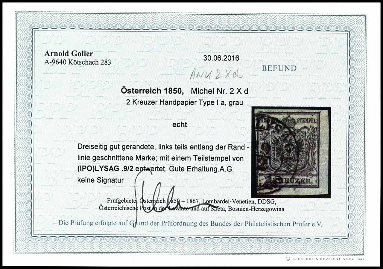 2 Kreuzer Wappenausgabe, 1850, Handpapier, seltene Farbnuance: grau, ANK-Nr. 2HI, entwertet mit Doppelkreisstempel "(IPO)LYSAG. 9/2", links entlang der Randlinie geschnitten und unten etwas berührt, die drei anderen Seiten breitrandig, farbfrisches Exemplar, tadellos, Fotobefund Arnold Goller BPP (2016) "gute Erhaltung", ANK 620.-