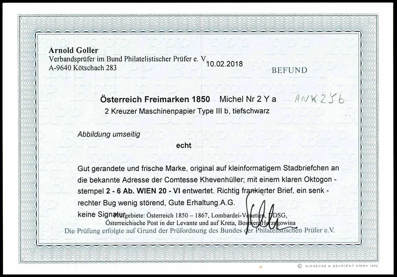 2 Kreuzer Wappenzeichnung, tiefschwarz, Maschinenpapier, Ferchenbauer Type IIIb allseits vollrandig, entwertet mit Oktogonstempel "3-6 Ab. WIEN 20-VI", klar abgeschlagen auf kleinformatiger Faltbriefhülle an die bekannte Adresse der Comtesse Khevenhüller, portorichtig, senkrechter Bug, ansonsten tadellos, Fotobefund Arnold Goller BPP (2018), ANK 600.-