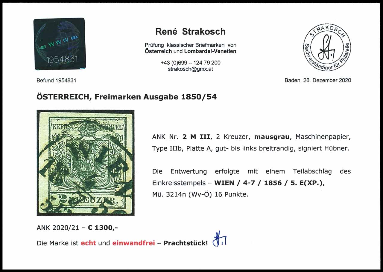 2 Kreuzer Wappenausgabe, 1854, Maschinenpapier, seltene Farbnuance: mausgrau, ANK-Nr. 2MIII, entwertet mit Einkreisstempel "WIEN 4-7 1856 5.E(XP.)", allseitig gut gerandetes farbfrisches Exemplar, tadellos, geprüft Hübner, Fotobefund Rene Strakosch (2020) "echt und einwandfrei", ANK 1.300.-