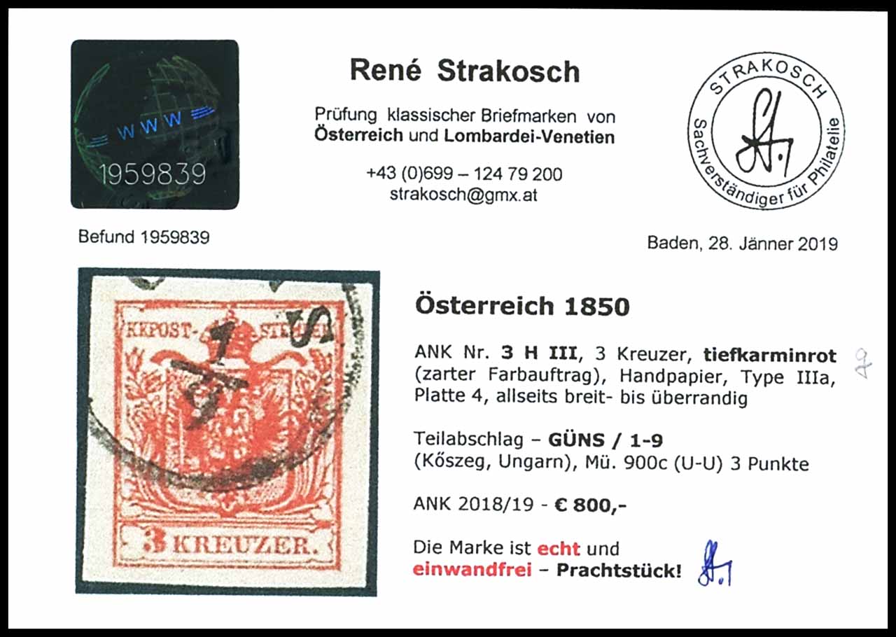 3 Kreuzer Wappenzeichnung, tiefkarminrot, Handpapier, Ferchenbauer Type IIIa Platte 4, allseits vollrandig, entwertet mit ungarischem Teilstempelabschlag "GÜNS 1-9...", tadellose Erhaltung, Bleistiftnotation, Fotobefund Rene Strakosch (2019), "echt und einwandfrei", ANK 800.-