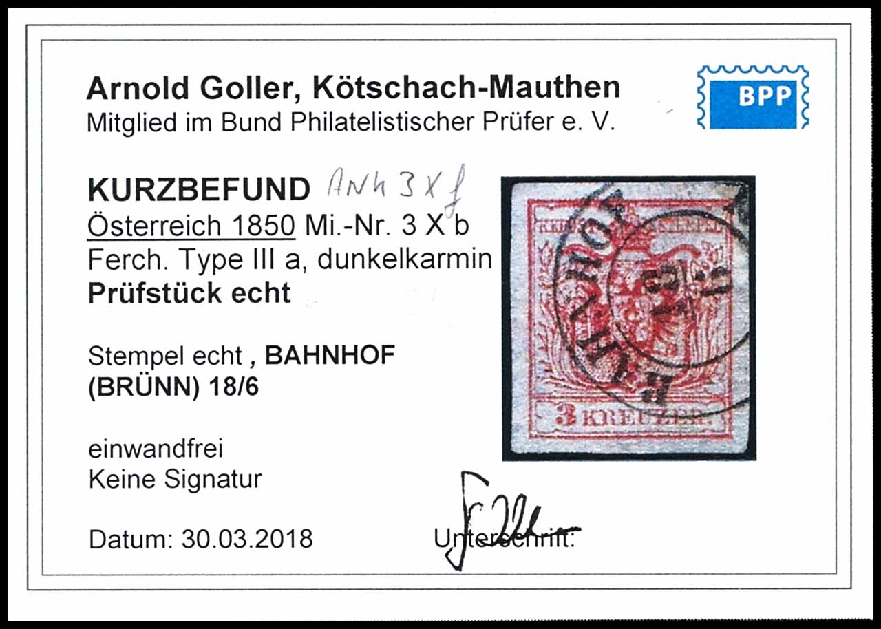 3 Kreuzer Wappenausgabe, 1850, Handpapier, Farbnuance: dunkelkarmin, ANK-Nr. 3HIII, Ferchenbauer Type IIIa, entwertet mit Doppelkreisstempel "BAHNHOF (BRÜNN) 18/6", allseitig vollrandig, farbfrisches Exemplar, Fotobefund Arnold Goller BPP, Mi. 80.-
