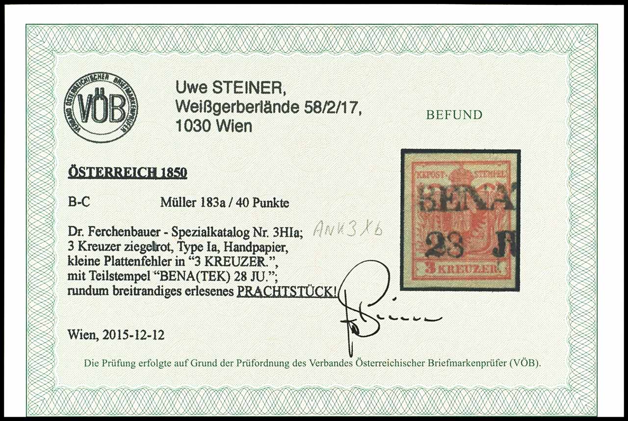 3 Kreuzer Wappenausgabe, 1850, Handpapier, Farbnuance: ziegelrot, ANK-Nr. 3HI, Ferchenbauer Type Ia, entwertet mit Teilstempel "BENA(TEK) 28 JU" Müller Nr. 183a 40 Punkte, allseitig vollrandig, farbfrisches Exemplar, Fotobefund Uwe Steiner VÖB