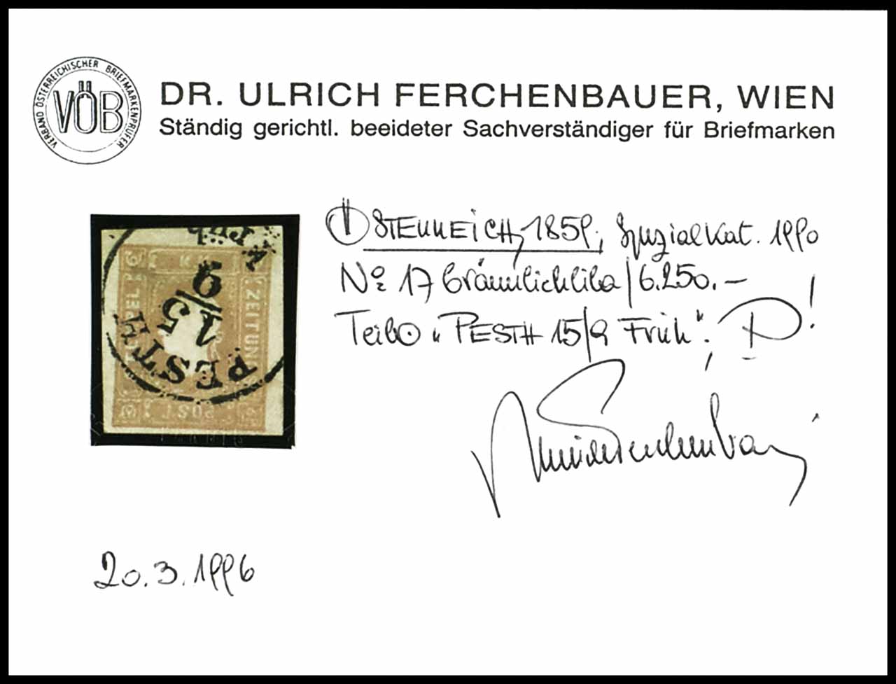 1858, 1,05 Kreuzer bräunlichlila, farbfrisches und vollrandiges Kabinettstück, entwertet "PESTH 15/9", Fotobefund Dr. Ulrich Ferchenbauer "P!", Mi. 400.- (ANK Nr. 17b / 450.-)