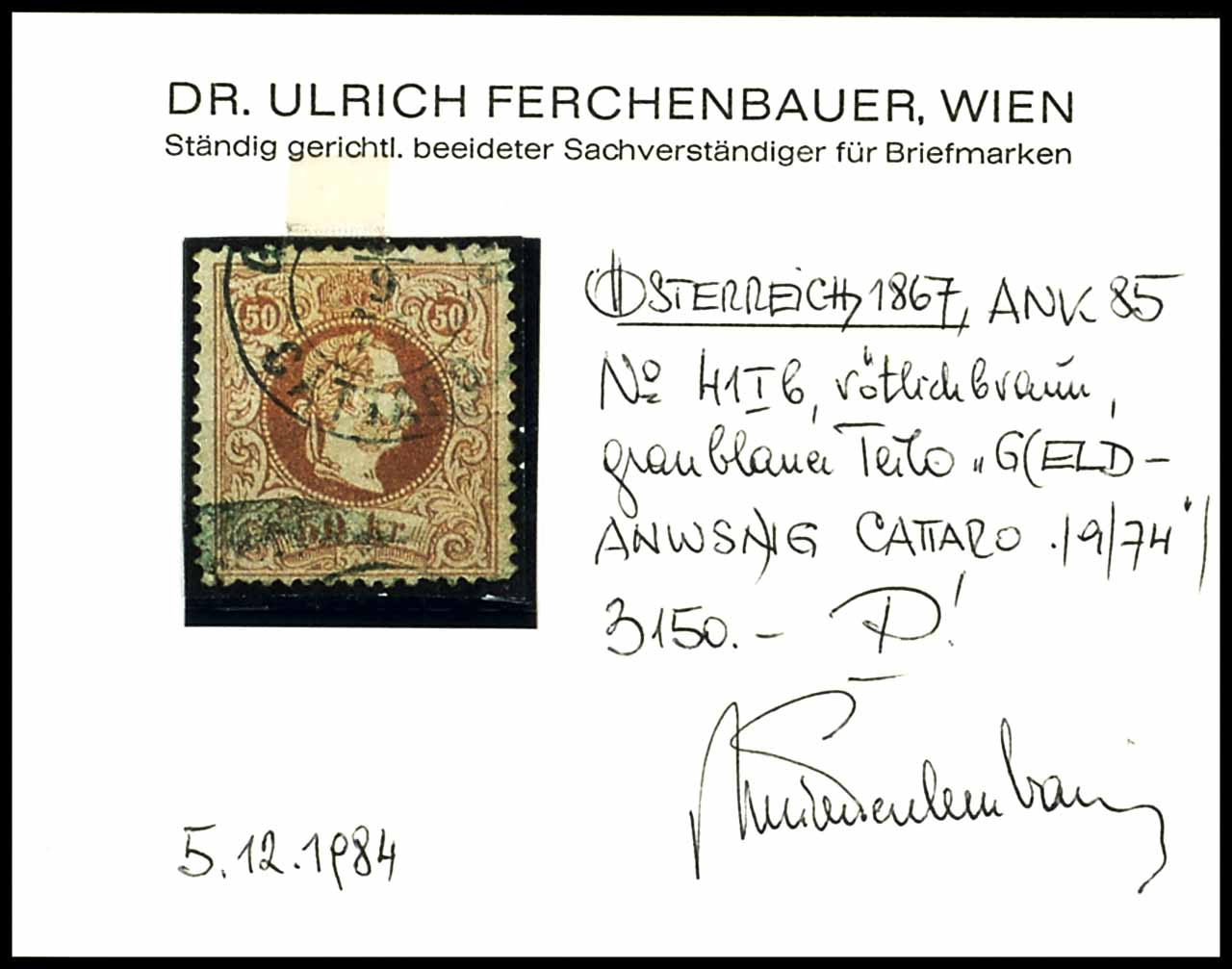 1867, 50 Kreuzer Franz Joseph rötlichbraun, grober Druck, entwertet "CATTARO ./9/74", tadellose Erhaltung, Fotobefund Dr. Ulrich Ferchenbauer VÖB "P!"