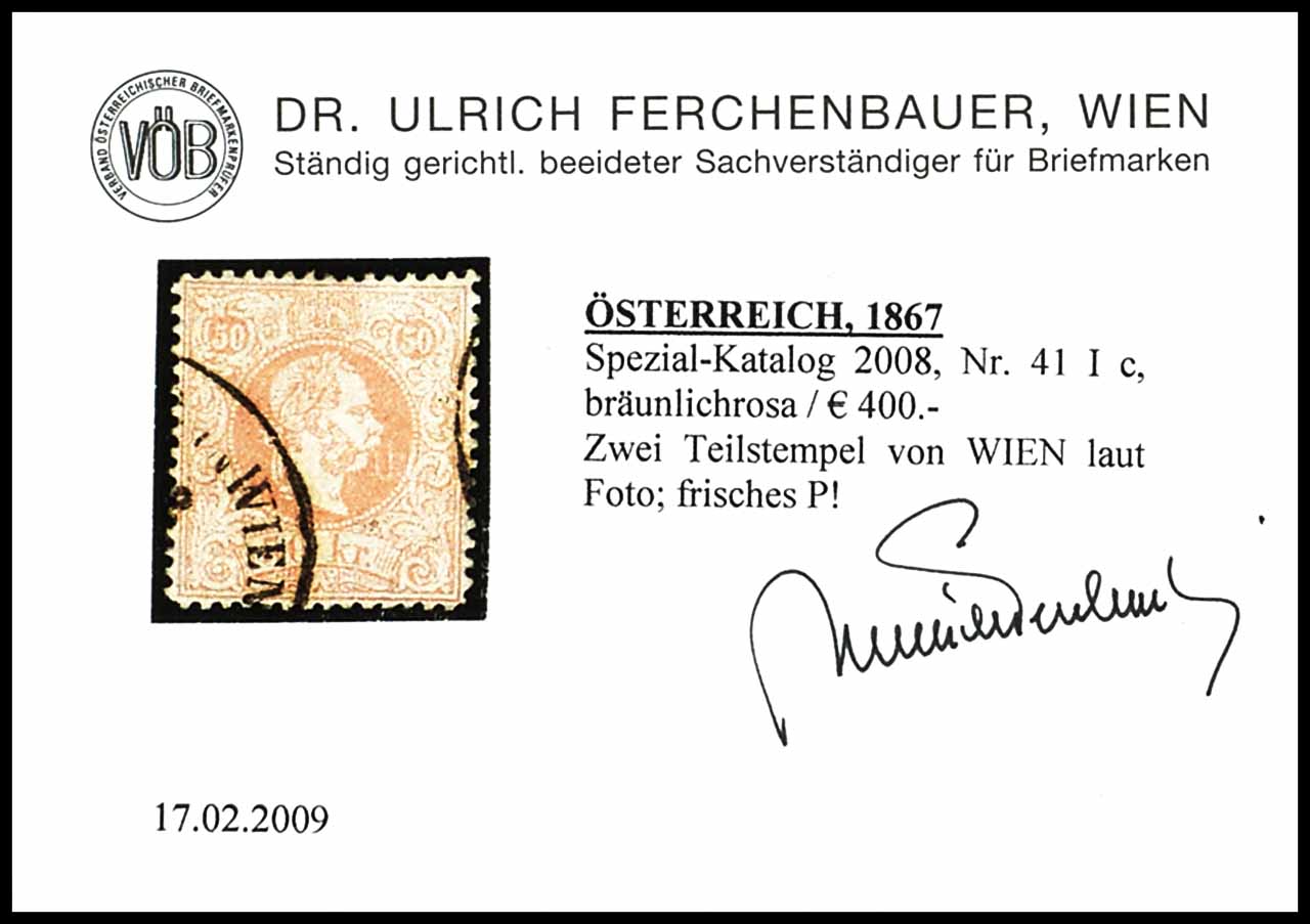 1867, 50 Kreuzer Franz Joseph, grober Druck, bräunlichrosa, tadellos gestempelt "WIEN", tadellose Erhaltung, Fotobefund Dr. Ulrich Ferchenbauer VÖB "frisches P!", Fb. 400.-