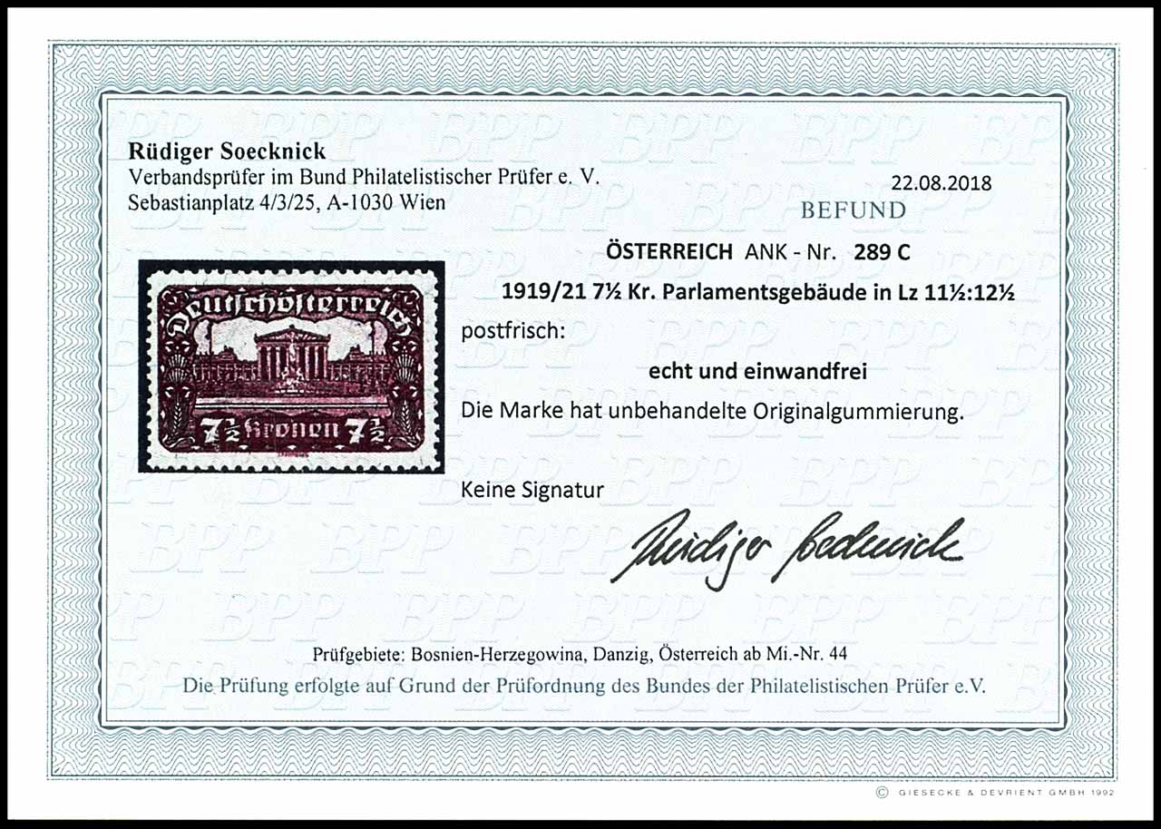 7 1/2 Kronen, Parlamentsgebäude, schwärzlichrotlila ANK-Nr. 289C, besondere Zähnung Lz 11 1/2 : 12 1/2, postfrisch, tadellos, Fotobefund Rüdiger Soecknick (BPP) "echt und einwandfrei", ANK 450.-