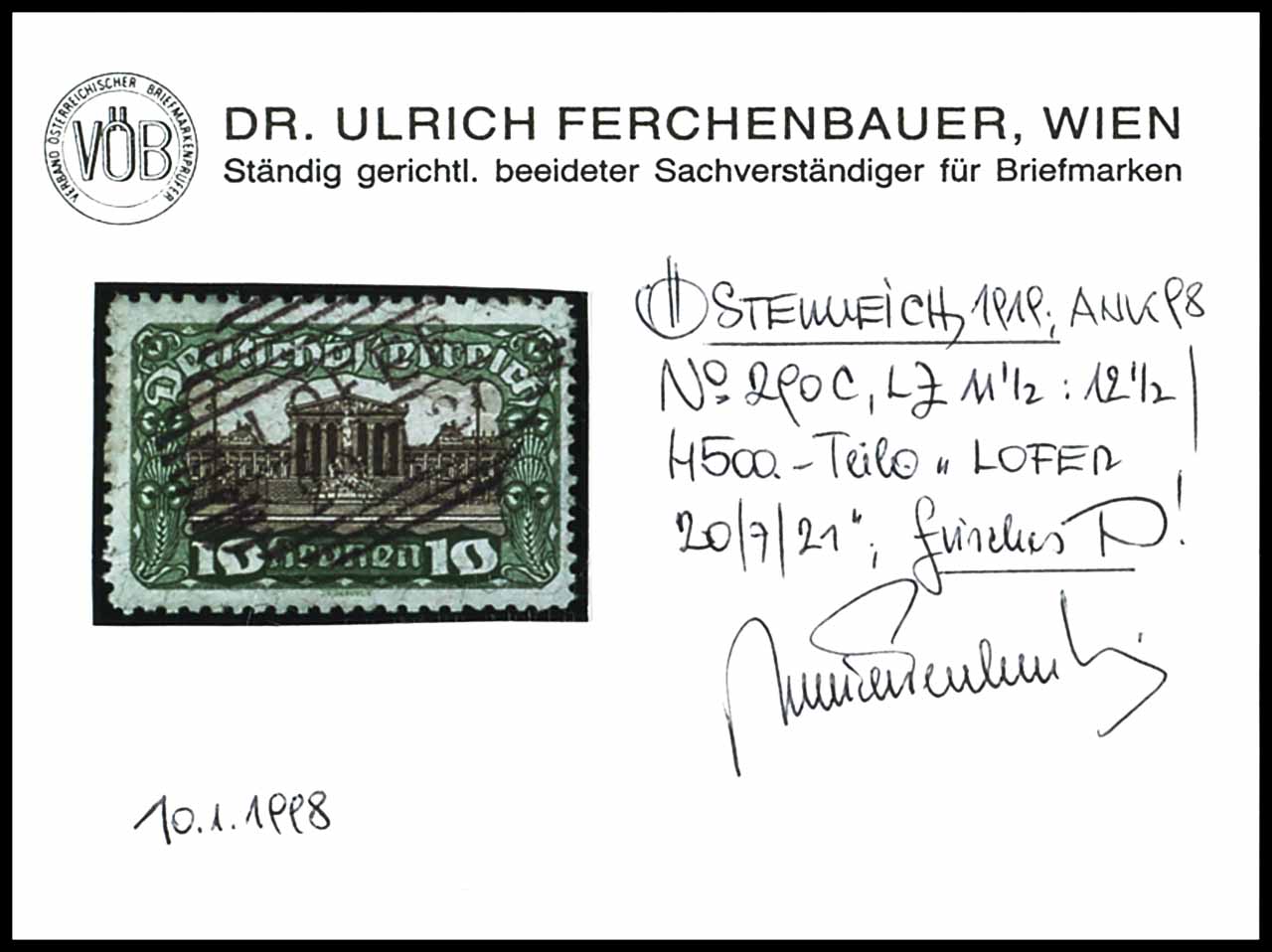 10 Kronen Parlamentsgebäude, gezähnt 11½:12½, schwarzgrünlicholiv/schwarzsiena, entwertet "LOFER 20/7/21", herstellungsbedingt etwas unregelmäßige Zähnung, tadellose Erhaltung, geprüft Ferchenbauer, Kurzbefund Dr. Ulrich Ferchenbauer VÖB (1998), Mi. 500.-