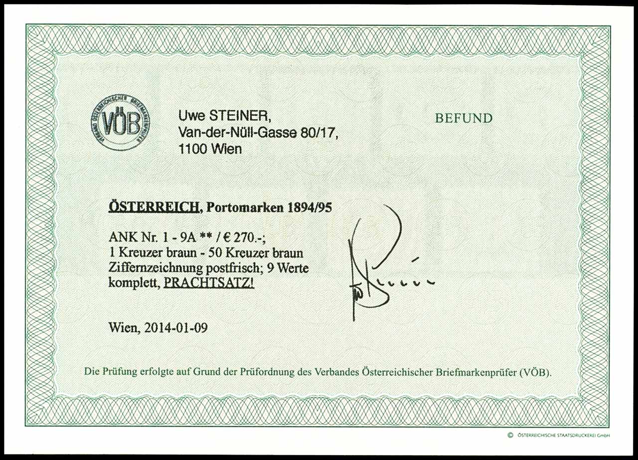 1 bis 50 Kreuzer Portomarken, postfrisch, tadellos, unsigniert, die Marke zu 10 Kreuzer fehlt, Befund Uwe Steiner VÖB (2014) "echt und einwandfrei", ANK 270.-