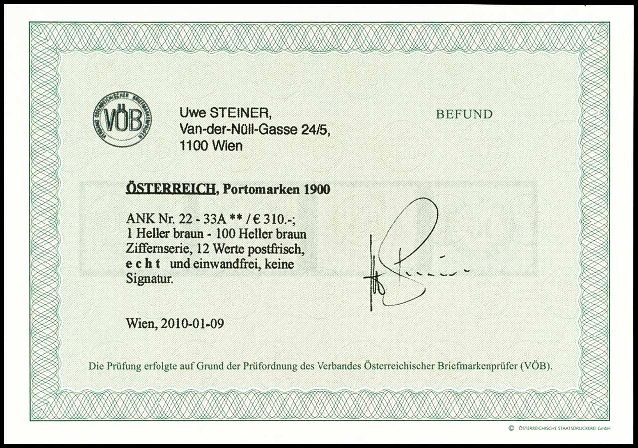 1 bis 100 Heller Portomarken, postfrisch, tadellos, unsigniert, Befund Uwe Steiner VÖB "echt und einmwandfrei", ANK 310.-