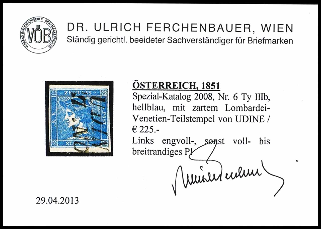 0,6 Kreuzer Zeitungsmarke 1851, Merkurkopf ohne Wertangabe, ANK-Nr. 6IIIb, hellblau, mit Lombardei-Venetien Teilstempel "UDINE", links knapp vollrandig, ansonsten breitrandiges Stück, signiert Ferchenbauer, Fotobefund Dr. Ulrich Ferchenbauer VÖB (2013), ANK 310.-+