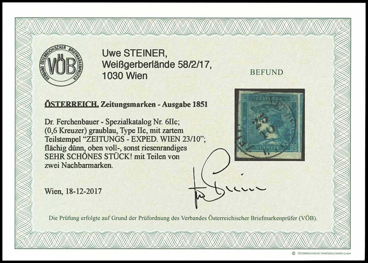 0,6 Kreuzer Zeitungsmarke 1851, Merkurkopf ohne Wertangabe, ANK-Nr. 6IIc, Type IIc, graublau, mit Teilstempel "ZEITUNGS-EXPED. WIEN 23/10", flächig etwas dünn, vollrandiges Stück mit Teilen von zwei Nachbarmarken, Mi. 130.-++