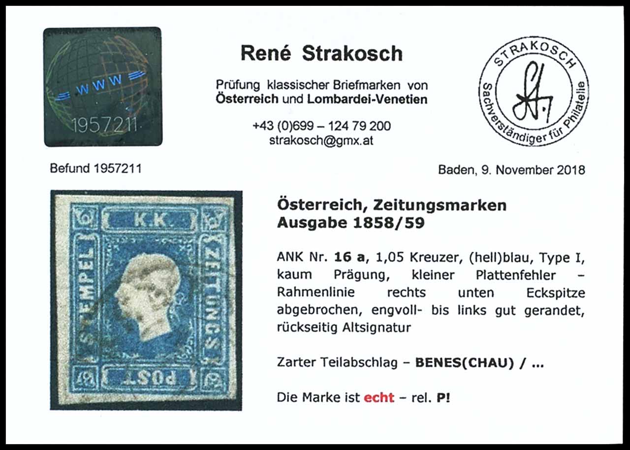 1,05 Kreuzer Zeitungsmarke 1858/59, Kaiserkopf nach links ohne Wertangabe, Prägedruck, ANK-Nr. 16a, hellblau, Type I, entwertet mit Teilabschlag "BENES(CHAU)", allseits vollrandiges Stück, mit Plattenfehler "Rahmenlinie rechts unten Eckspitze abgebrochen", signiert, Fotobefund Rene Strakosch (2018), Mi. 700.-+