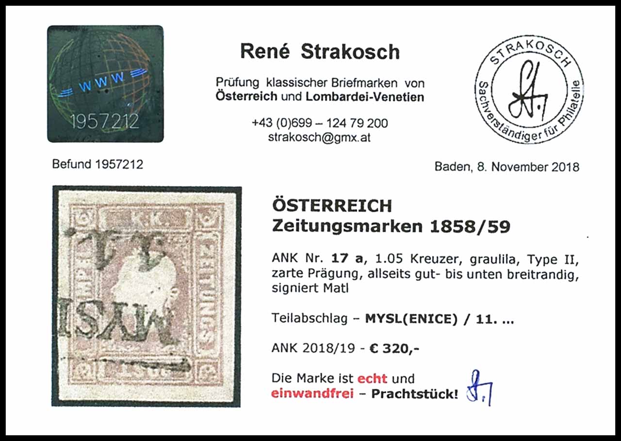 1,05 Kreuzer Zeitungsmarke 1858/59, Kaiserkopf nach links ohne Wertangabe, Prägedruck, ANK-Nr. 17a, graulila, Type II, entwertet mit Teilabschlag "MYSL(ENICE) /11...", allseits vollrandiges Stück, signiert, Fotobefund Rene Strakosch (2018) "echt und einwandfrei", ANK 320.-