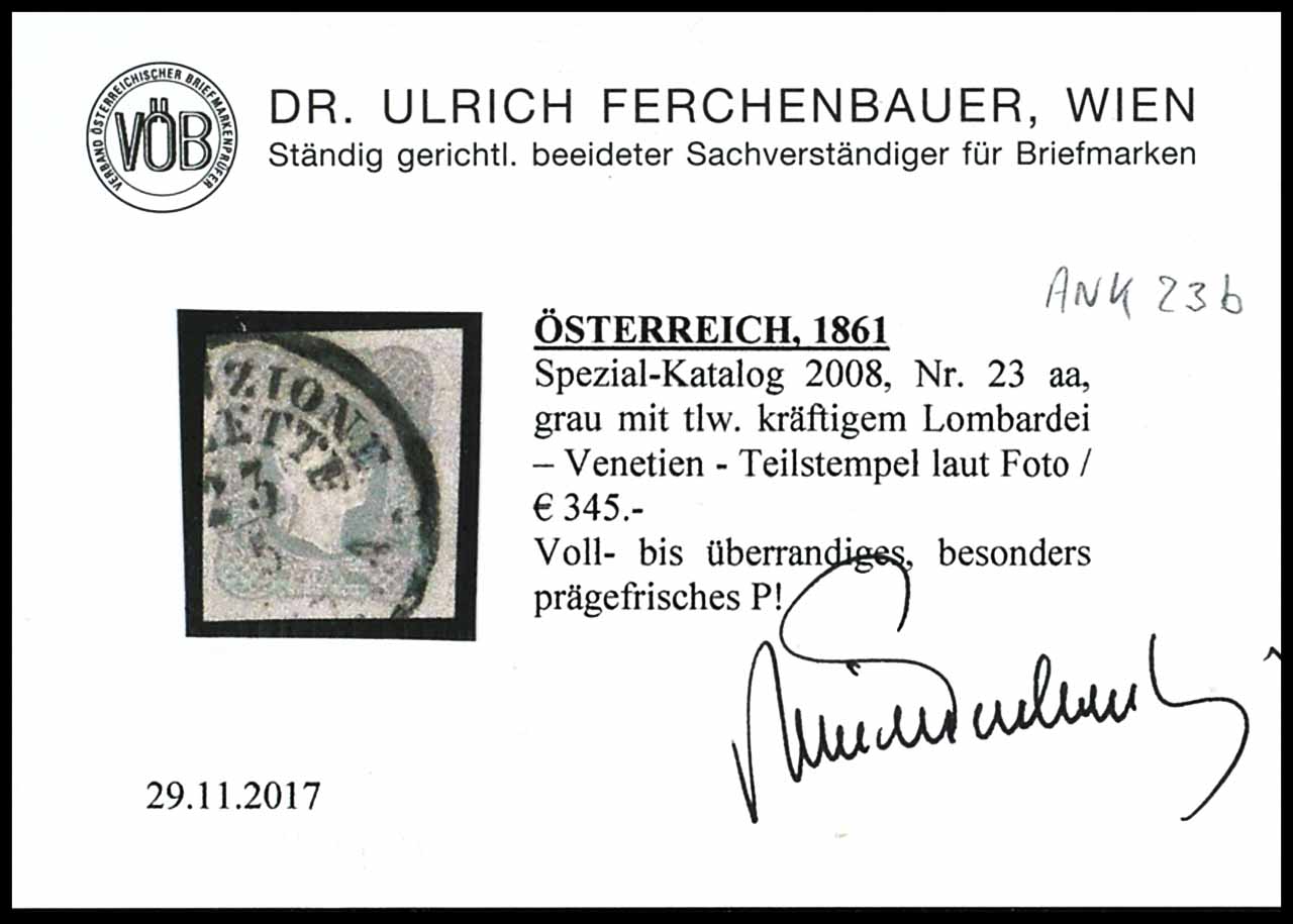 1,05 Kreuzer Zeitungsmarke 1860, Kaiserkopf nach rechts ohne Wertangabe, Prägedruck, ANK-Nr. 23b, grau, entwertet mit kräftigem Teilabschlag eines Lombardei-Venetien-Stempels, allseits vollrandiges Stück, farbfrisch, signiert, Fotobefund Dr. Ulrich Ferchenbauer VÖB (2017), ANK 280.-