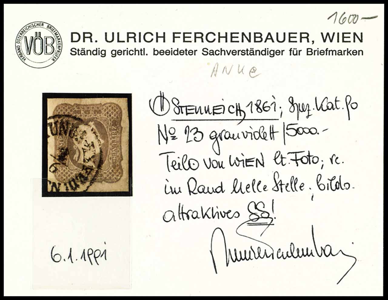 1,05 Kreuzer Zeitungsmarke 1860, Kaiserkopf nach rechts ohne Wertangabe, Prägedruck, ANK-Nr. 23e, grauviolett, im Rand helle Stelle, entwertet mit Teilabschlag eines Einkreisstempels von "WIEN...", allseits vollrandiges Stück, farbfrisch, signiert, Fotobefund Dr. Ulrich Ferchenbauer VÖB (1991), ANK 300.-