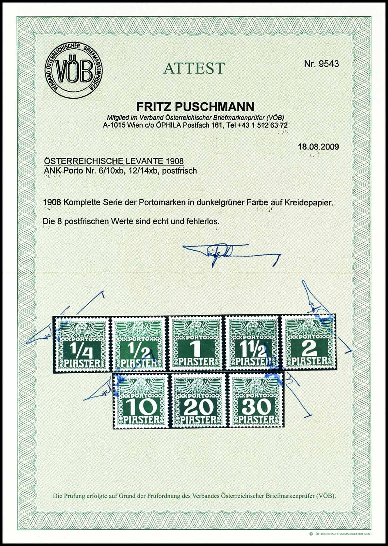1/4 Piaster bis 30 Piaster, Portomarken für die Levante auf Kreidepapier, 1908, b-Farbe dunkelgrün, kompletter Satz mit 8 Werten, postfrisch, tadellose Erhaltung, unsigniert, Attest Fritz Puschmann VÖB (2009) "echt und fehlerlos", Mi. 280.-
