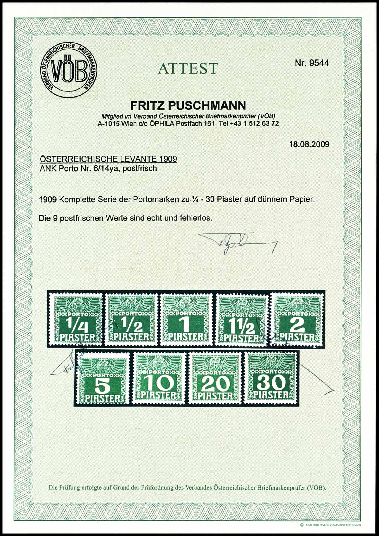 1/4 Piaster bis 30 Piaster, Portomarken für die Levante auf glanzlosem, dünnem Papier, 1909, kompletter Satz mit 9 Werten, postfrisch, tadellose Erhaltung, Attest Fritz Puschmann VÖB (2009) "echt und fehlerlos", Mi. 280.-
