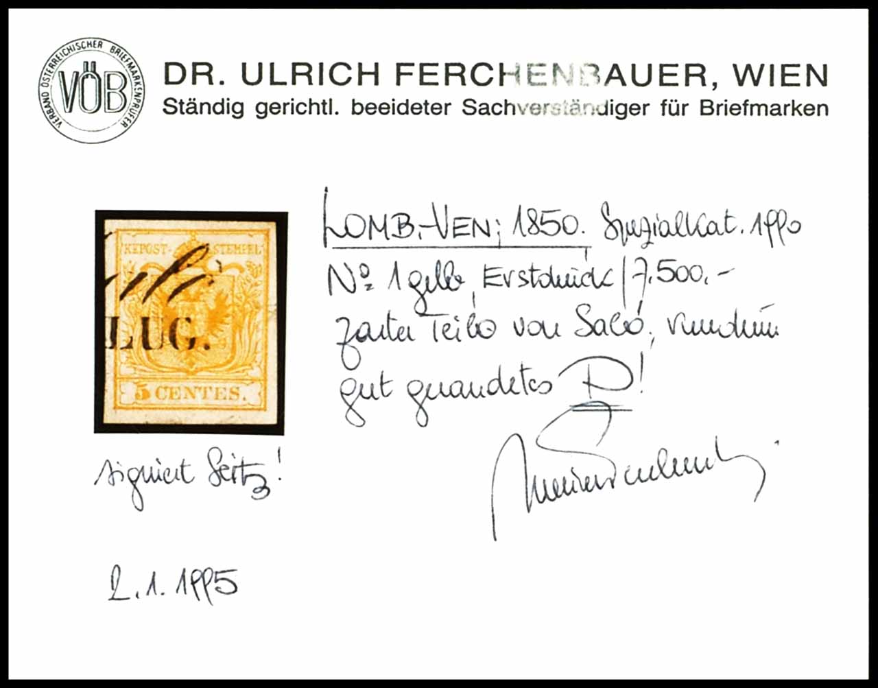 5 Centesimi, ockergelb, Erstdruck 1850, auf gewöhnlichem Handpapier mit Bogenwasserzeichen 1, zarter Teilstempelabschlag von "Salo", allseitig vollrandiges Stück, tadellose Erhaltung, signiert Seitz, Kurzbefund Dr. Ulrich Ferchenbauer VÖB (1995)
