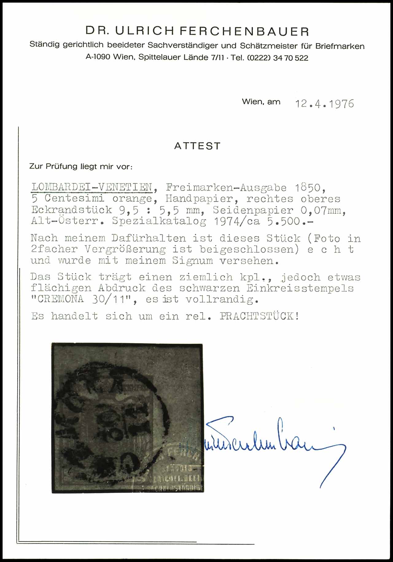 5 Centesimi, ockergelb, 1850, auf gewöhnlichem Handpapier mit Bogenwasserzeichen 1, rechtes oberes Eckrandstück, entwertet mit Vollstempel "CREMONA 30/11", allseitig vollrandiges Stück, tadellose Erhaltung, signiert Ferchenbauer, Attest Dr. Ulrich Ferchenbauer (1976), gestempelte Eckrandstücke sind selten
