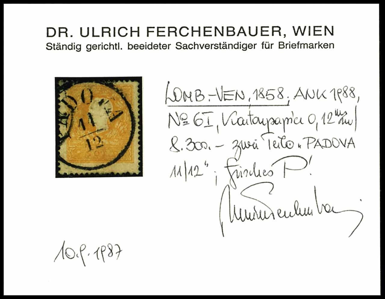 2 Soldi, gelb, 1858, auf Kartonpapier, zwei Teilstempelabschläge von "PADOVA 11/12", gezähnt K 14 1/2, tadellose Erhaltung, signiert Ferchenbauer, Kurzbefund Dr. Ulrich Ferchenbauer VÖB (1987), Mi. 550.-