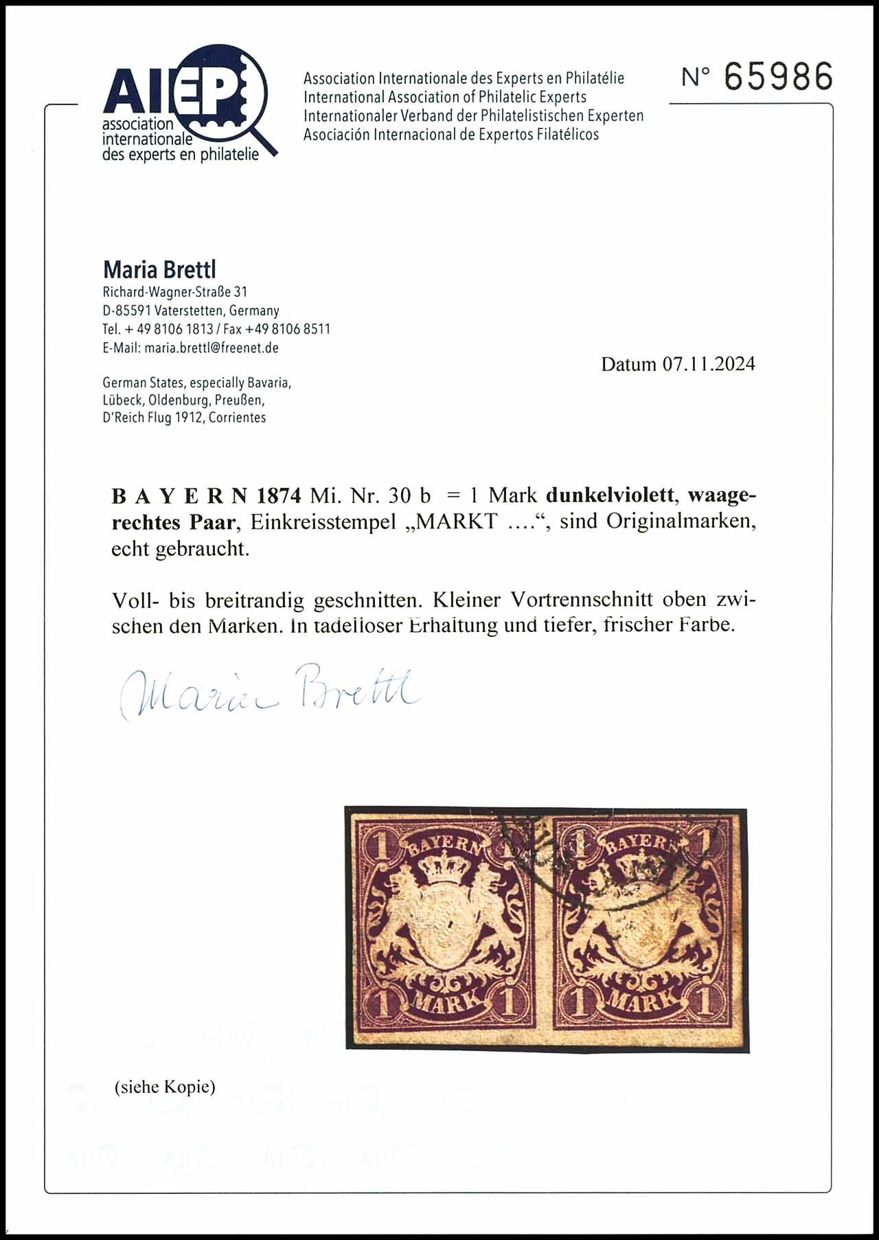 1 Mark dunkelviolett, voll bis breitrandig, gestempelt, entwertet mit Teilabschlag eines Einkreisstempels von "MARKT.......", waagrechtes Paar, kleiner Vortrennschnitt oben zwischen den Marken, sehr farbfrisch, tadellose Erhaltung, Fotoattest Maria Brettl AIEP (2024), Mi. 700.-
