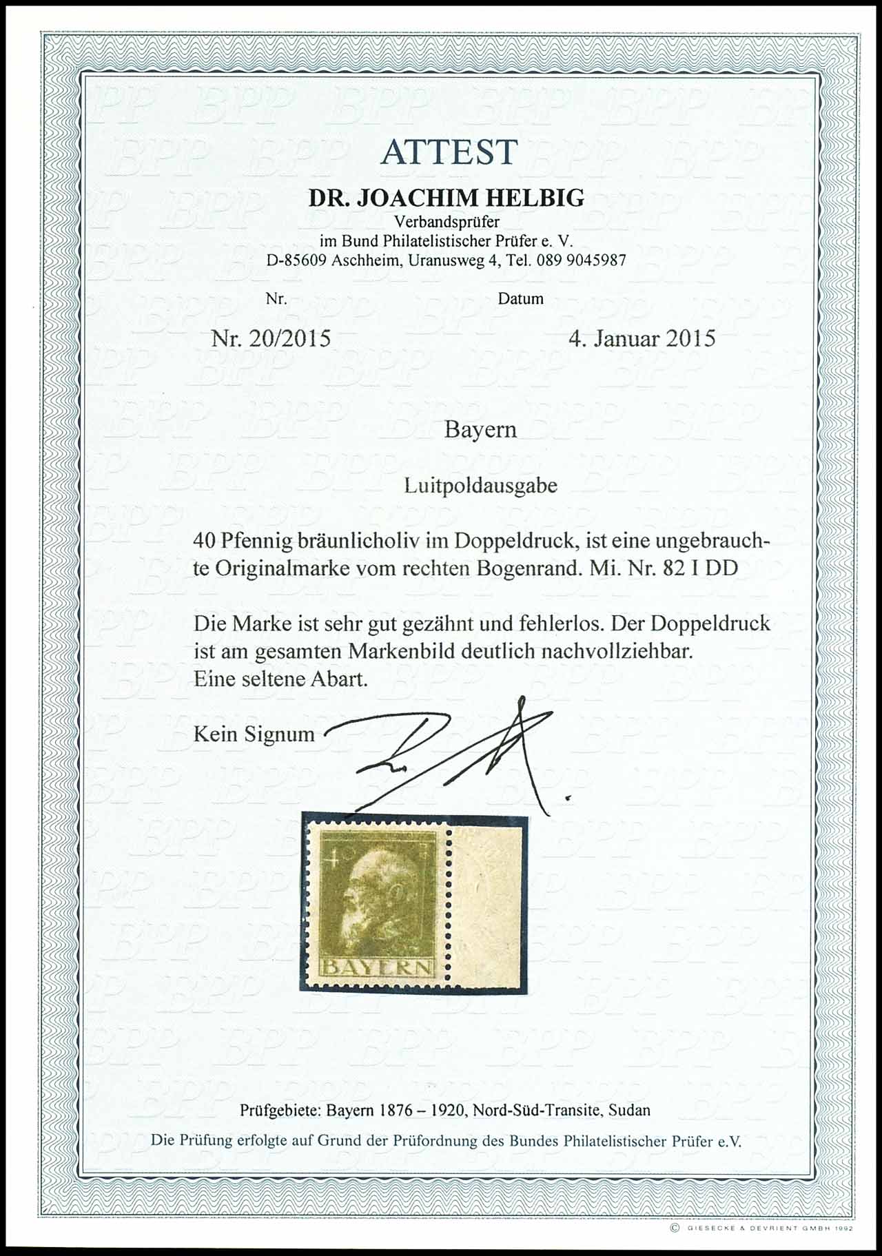 40 Pfennig 90. Geburtstag von Prinzregent Luitpold, Type I, Abart "Doppeldruck", vom rechten Bogenrand, ungebraucht mit Originalgummierung, tadellose Erhaltung, unsigniert, Fotoattest Dr. Joachim Helbig BPP "fehlerlos .... Eine seltene Abart.", im Michel Deutschland Spezial nicht gelistet!