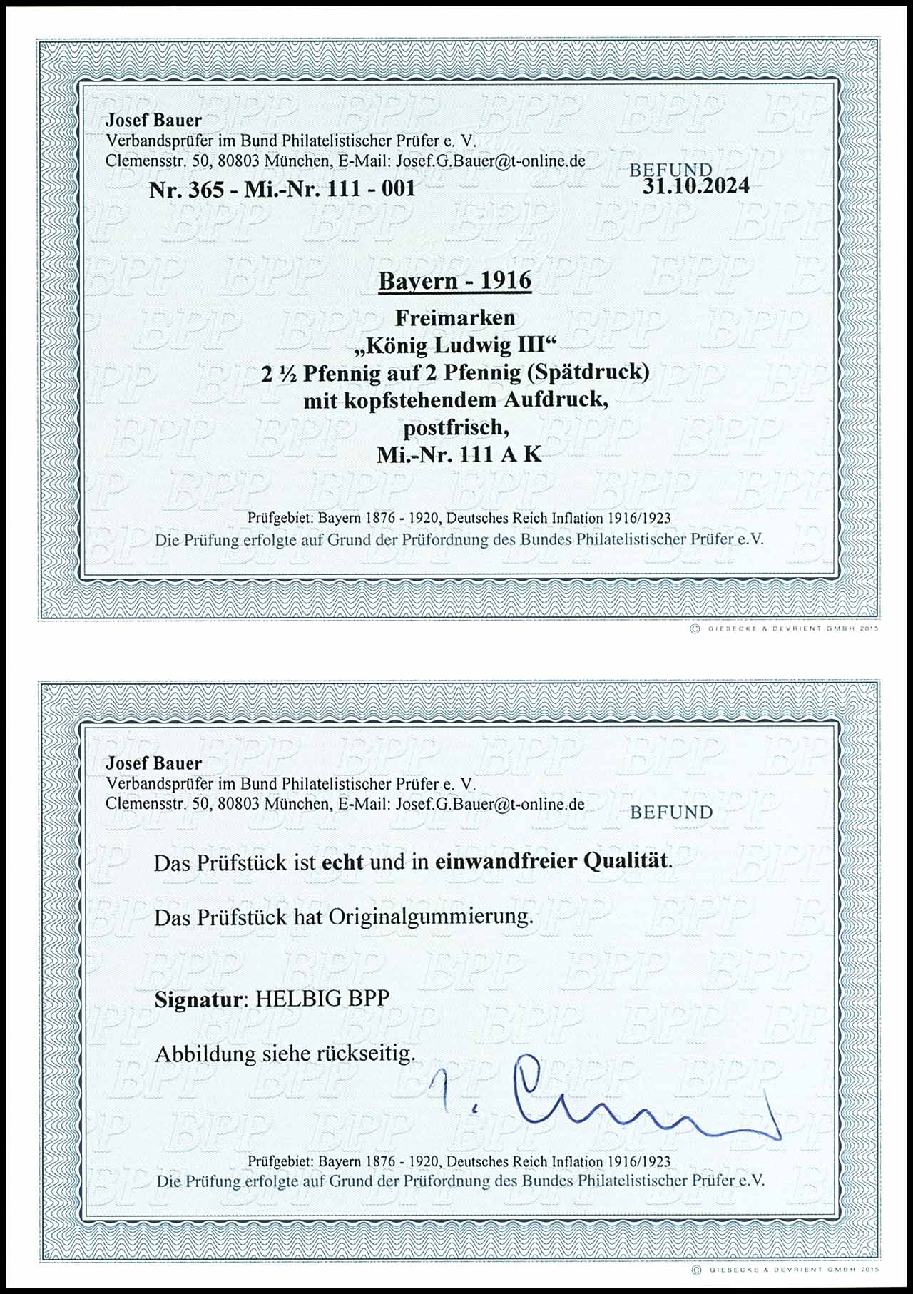 2 1/2 Pfennig schwarzer Buchdruck-Aufdruck, kopfstehend, auf 2 Pfennig König Ludwig III., tadellose Erhaltung, postfrisch, geprüft Helbig BPP, Fotobefund Josef Bauer BPP (2024), Mi. 350.-