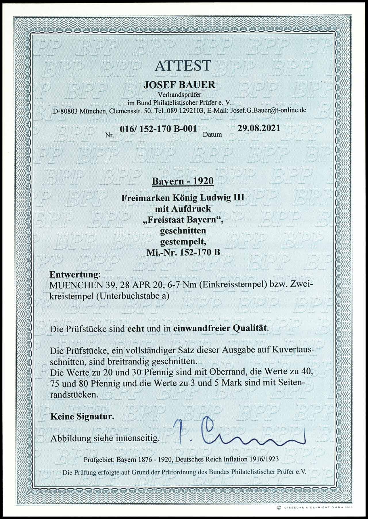 5 Pfennig bis 20 Mark König Ludwig III. mit Aufdruck "Freistaat Bayern", geschnitten, kompletter Satz mit 19 Werten, entwertet MÜNCHEN 39 28 APR 20 auf Briefstücken, tadellose Erhaltung, Fotoattest Josef Bauer BPP "in einwandfreier Qualität."